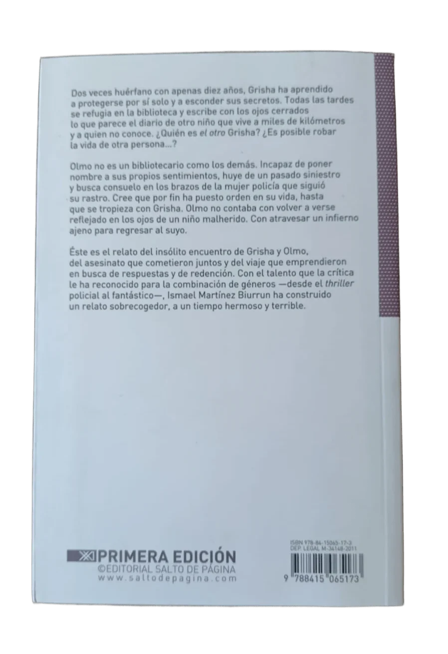 Olmo no es un bibliotecario como los demás. Incapaz de poner nombre a sus propios sentimientos, huye de un pasado siniestro y busca consuelo en los brazos de la mujer policía que siguió su rastro. Cree que por fin ha puesto orden en su vida, hasta que se tropieza con Grisha. Olmo no contaba con volver a verse reflejado en los ojos de un niño malherido. Con atravesar un infierno ajeno para regresar al suyo.